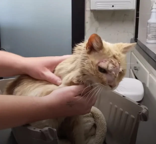 On his forehead, he had a hairless patch that stretched to one eye. The vets also discovered a bloated portion of his body that only allowed one of his eyes to open half-way.
