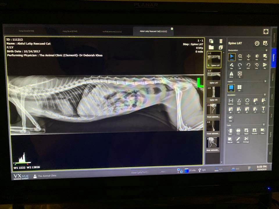 Despite the fact that the X-ray did not reveal broken bones, the cat was unable to walk or stand. This was suspected to be the result of nerve damage by humans or homeless animals.