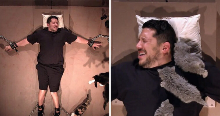 In this funny clip you are about to see, Sal, a man who is deathly afraid of cats, is tied down by his friends and covered with kitties.