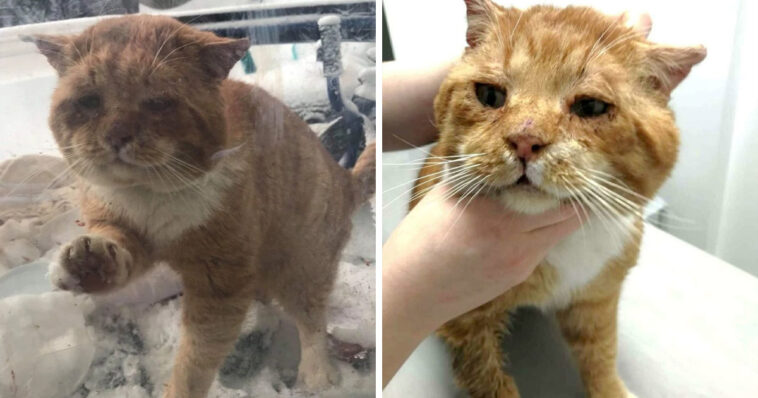 A lady heard weeping coming from her garden on Valentine’s Day. She discovered an orange cat standing in the snow, looking a little battered.