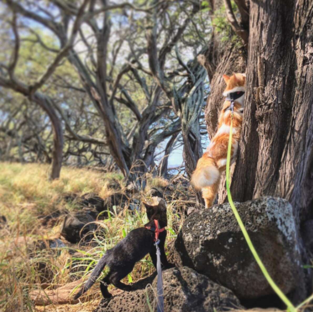 “On his leash adventures he gets to safely experience the beauty of Hawaii and the outdoors,” Christie added. “He gets to walk the beach and climb trees.”