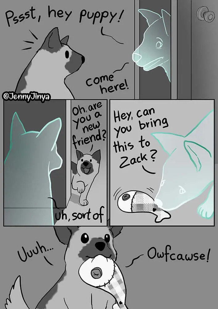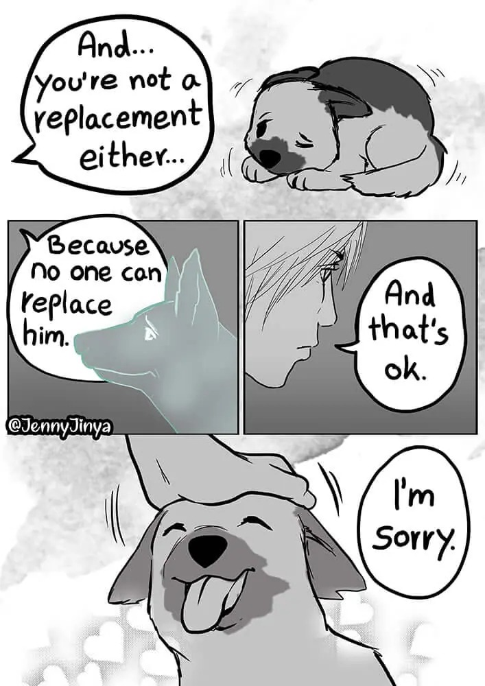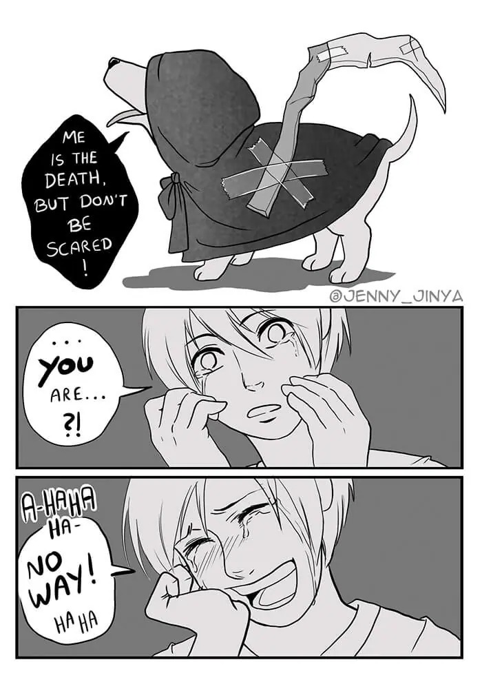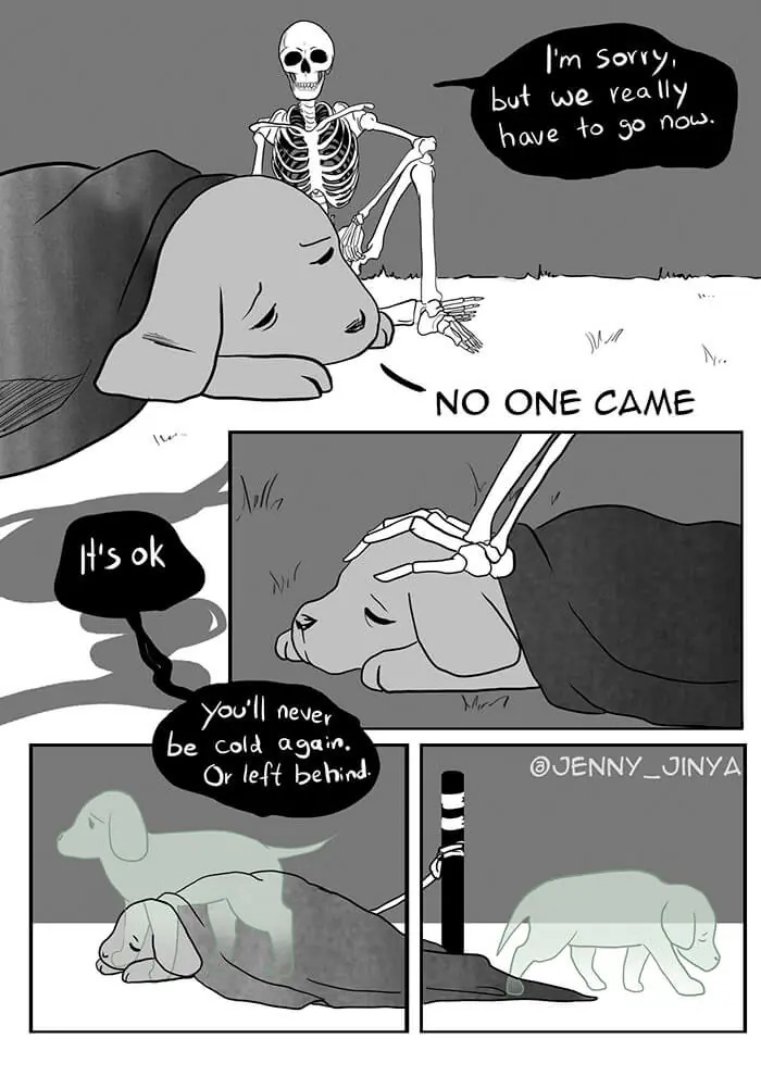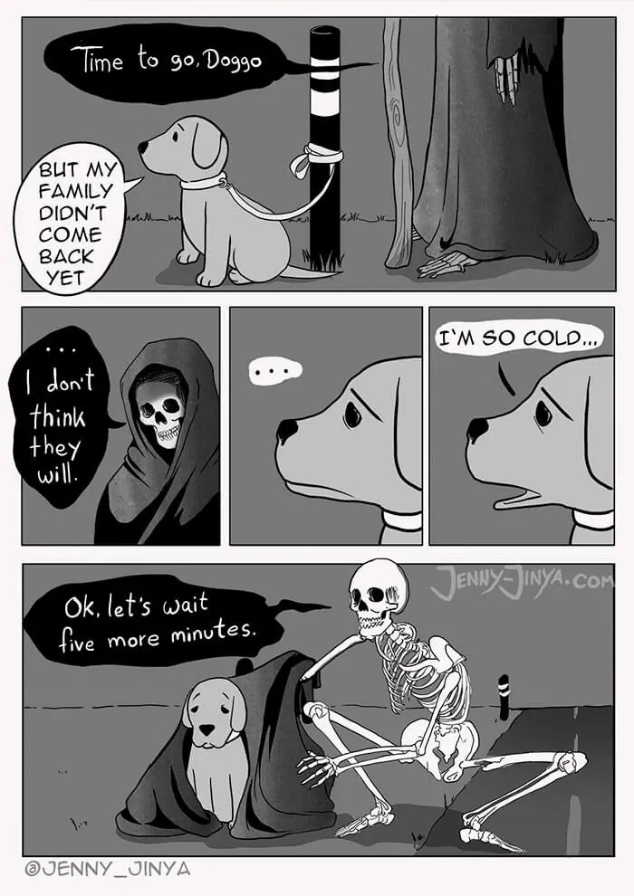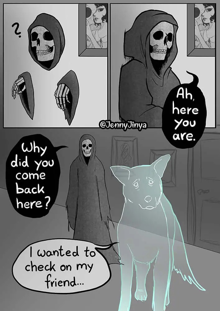 Jenny is an artist who is famous for her comic series “Loving Reaper”. Her comics are mostly about what the after-lives are like for dogs and cats. Her intention when creating this series was to raise awareness about the good and the bad in the relationship between us humans and our pets.