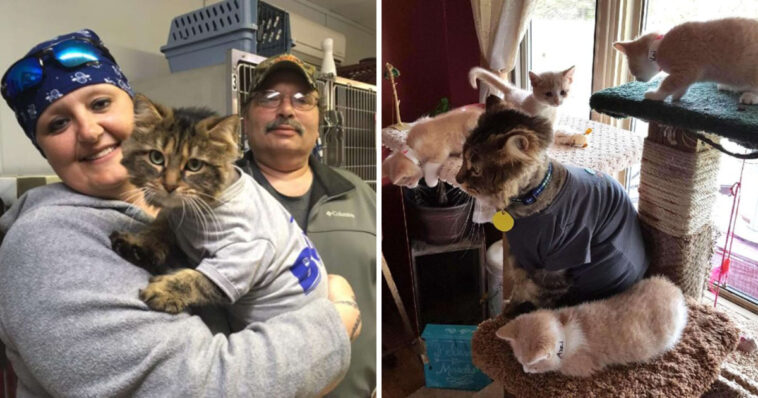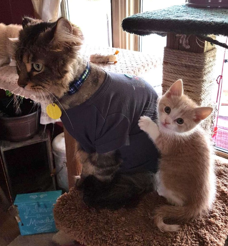 While volunteering at the shelter, Toll fell in love with Apollo’s sweet nature, and she decided to adopt him. He managed to fit in fairly well with her other cat and two dogs. But Toll didn’t know how he’d be around tiny, mischievous kittens.