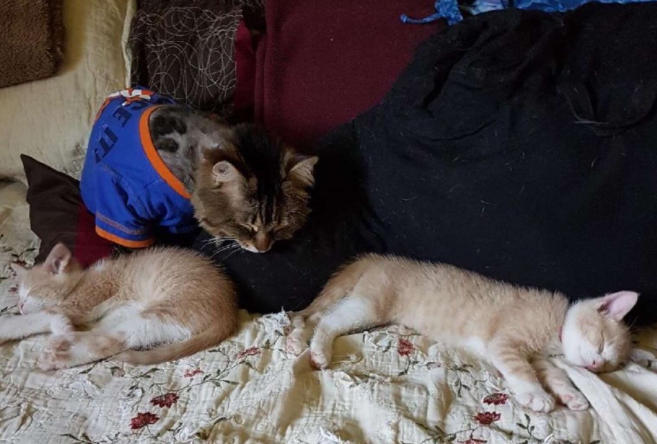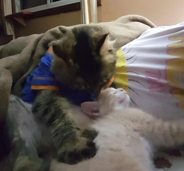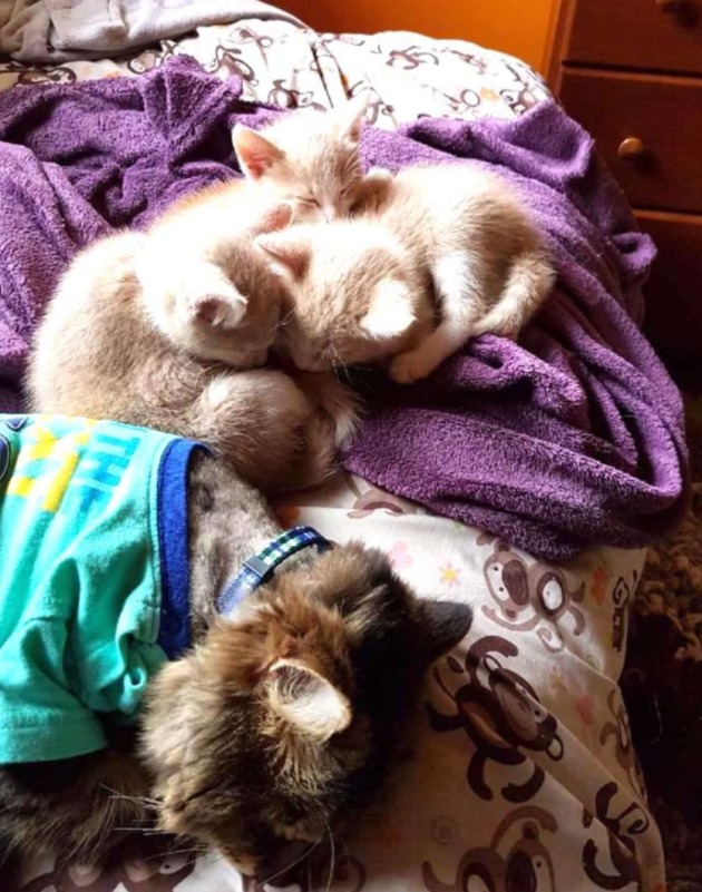 “He would go in [their room] at feeding time, and then I noticed he’d start lying up on the bed, allowing the kittens to lie close to him,” Toll said.