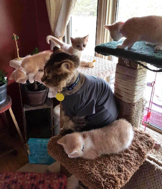 “They’d play together on the cat tree,” she added. “Apollo would lie there and watch, and the kittens would be all over the cat tree and all over him, running around.”