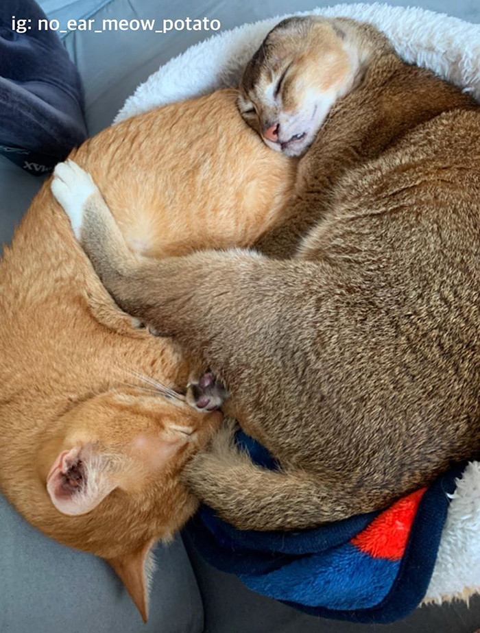 Potato, thankfully, is doing well and has found a lifelong home as well as a new best friend in Horlick. Despite without having ears, the lovely cat’s new owners revealed on Instagram that he can still hear.
