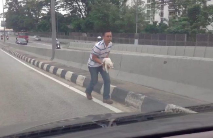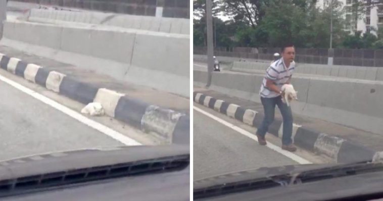 Masz Masuri and his son JB were traveling to Danga Bay, a recreational resort in Malaysia, when they encountered an unfortunate abandoned stroller near the central highway barrier. The father and son made a round trip to rescue the animal after seeing it shivering with horror.