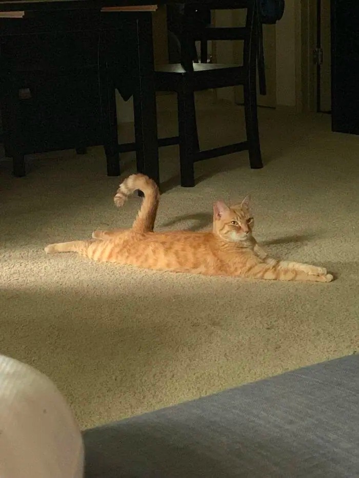 #10 Sunset sploot with bonus crossed paws and fancy tail
