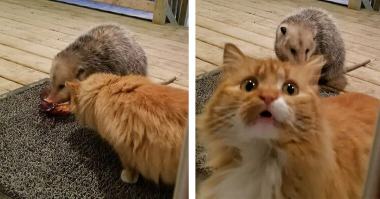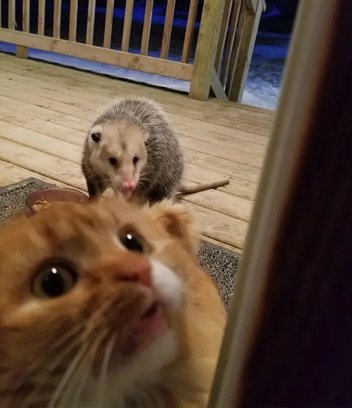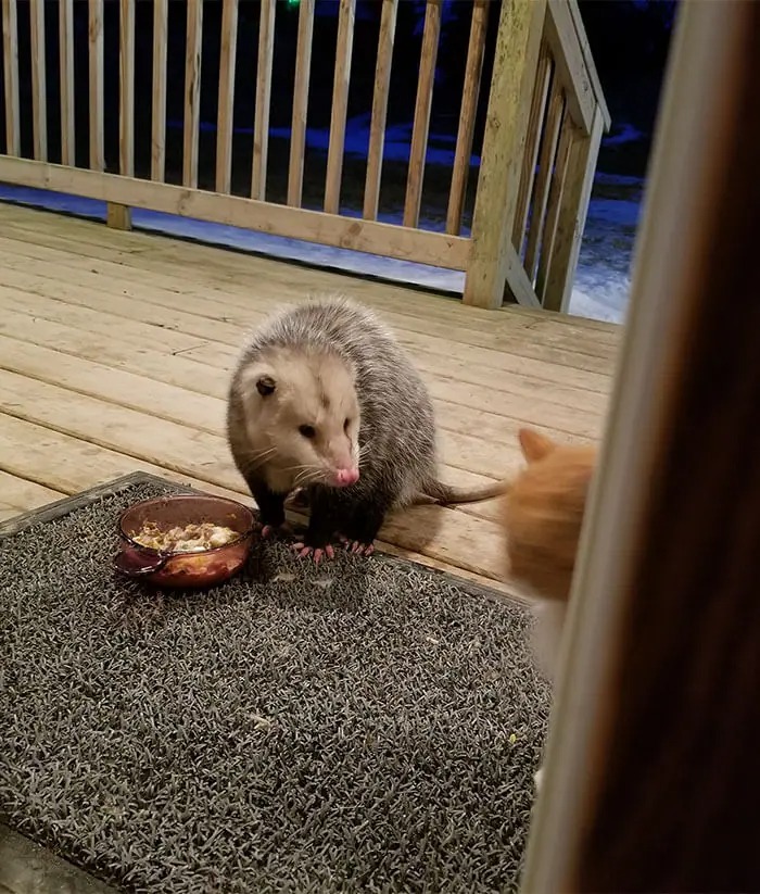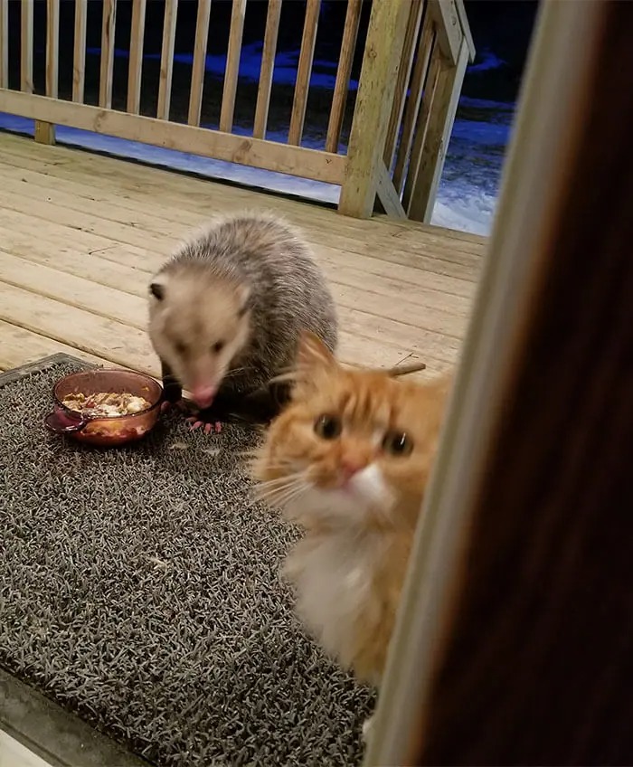 There was a story posted by the cat owner MrRogers247 on Imgur about how his kitty reacted when an uninvited guest – a hairy and brave possum – stole her dinner meal. Seems like the possum didn’t give a darn about the food bowl while this floofy girl was begging the guy for giving some help. Her eyes were about to burst into tears, she temporary lost her carnivores instinct although she was trying to make friends with the wild possum and wanting to be shared the food with.