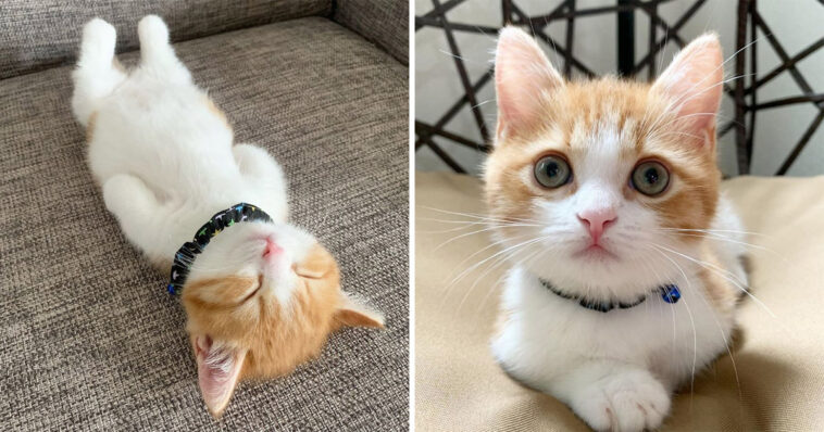 There are cats who love sleeping on the side or curled up and that’s really cute but one of our absolute favorite sleeping cat positions is when they lay flat on their back with their legs straight almost looking like a human! And one orange and white calico munchkin cat named Chata is actually pretty famous for this.