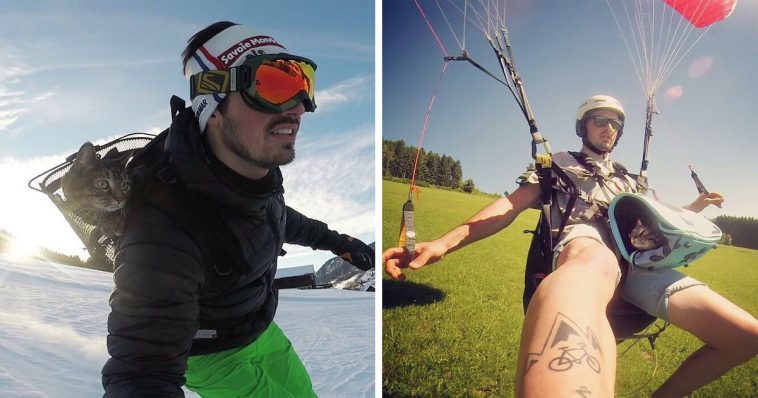 Rémy Vicarini adopted this cat from a shelter six years ago and takes it in all sorts of activities, including motorbike, mountain climbing and parachuting. Cathode has had so many adventures that he has nothing to do but envy. Of course, Remi always makes sure his cat is safe and sound. The cathode is always placed first by the owner, who never does anything he does not want to do.