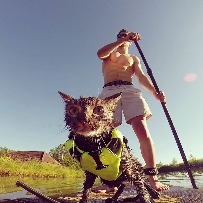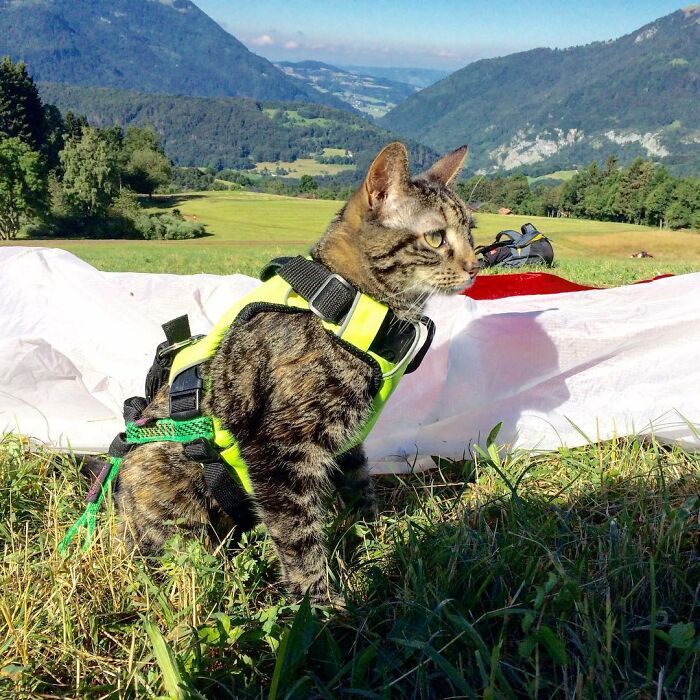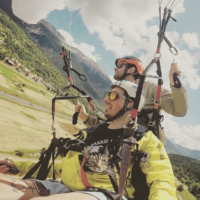 Rémy Vicarini adopted this cat from a shelter six years ago and takes it in all sorts of activities, including motorbike, mountain climbing and parachuting. Cathode has had so many adventures that he has nothing to do but envy. Of course, Remi always makes sure his cat is safe and sound. The cathode is always placed first by the owner, who never does anything he does not want to do.