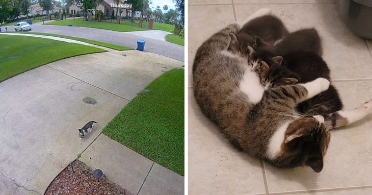 Peltier told The Dodo, “I saw Amelia had brought the kittens to my house one by one on Thursday afternoon.” “I was astounded when I saw the video of her bringing the kittens over. A tropical storm had just passed across Florida the day before. I’m guessing she went hunting for a secure place to deposit her babies the next day.”