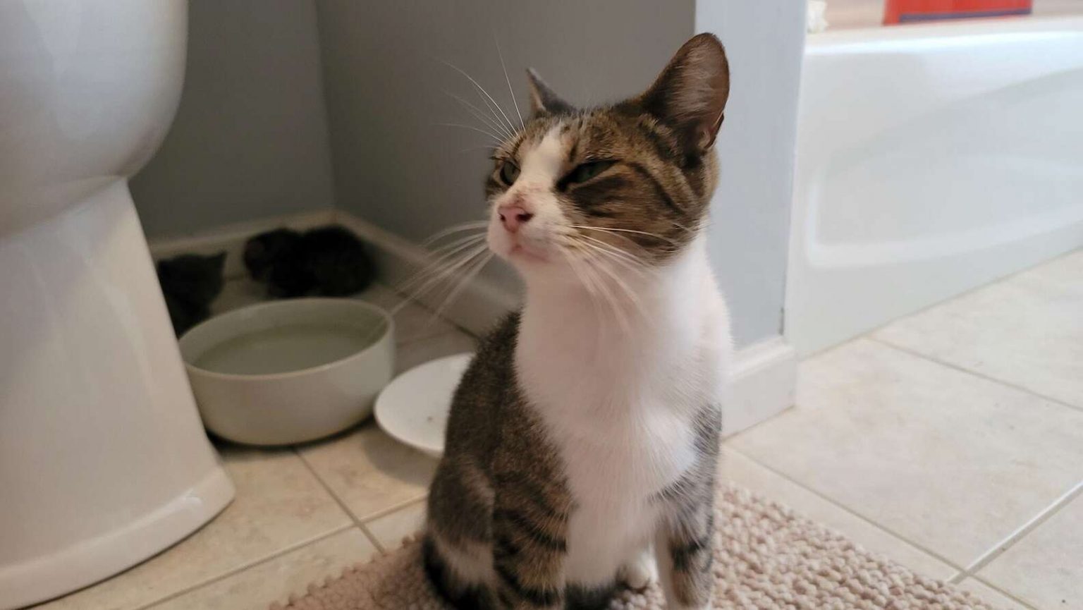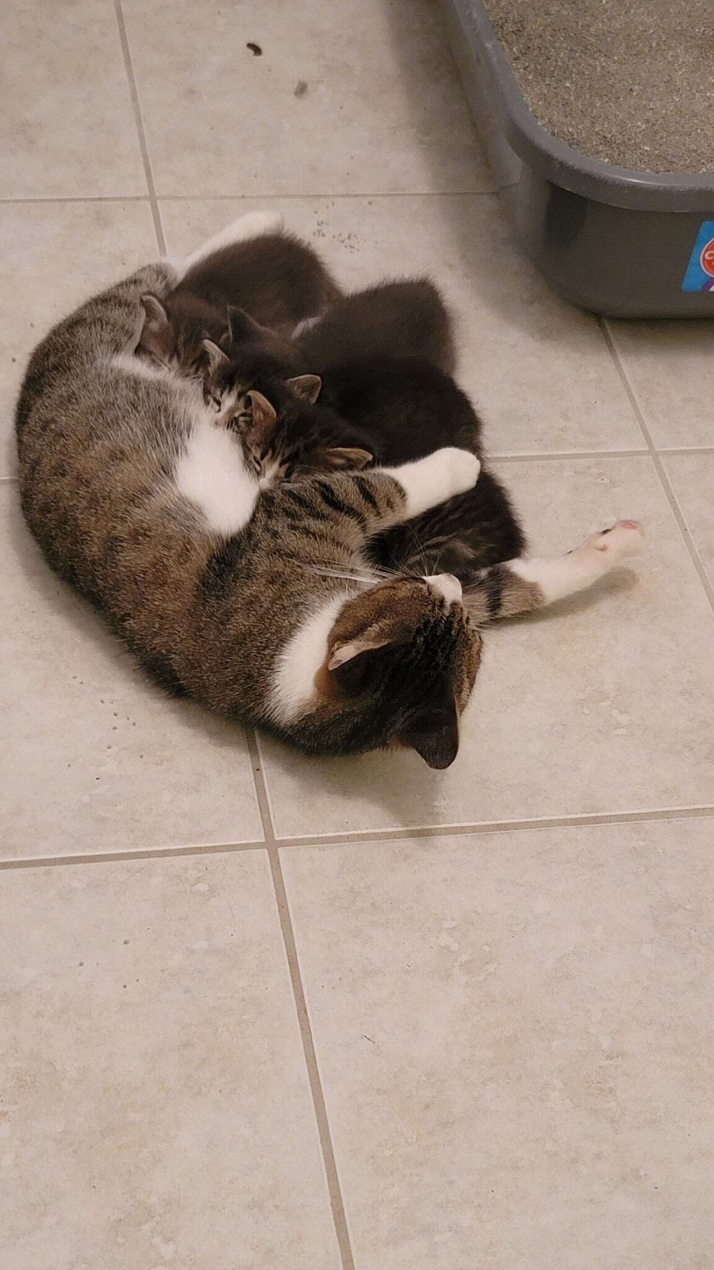 Amelia, the mother cat, was a stray who was well-known in the area, but no one had ever seen her with kittens before. Peltier went inside to prepare the restroom for Amelia and her kids, and when he returned, two more kittens had come out of nowhere.