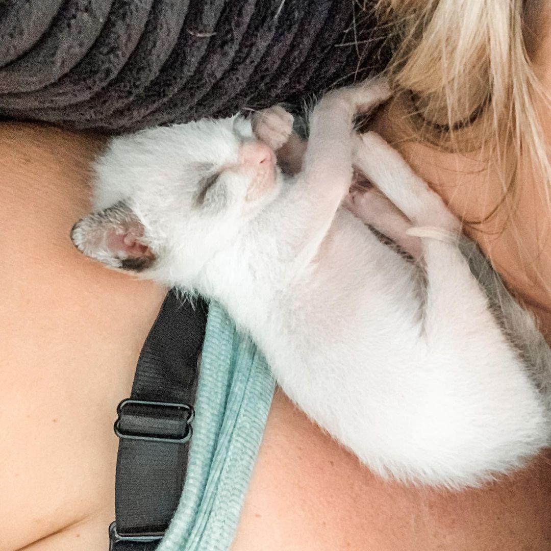 Guinness, the kitten, struggled to eat from the bottle and syringe, so he was drip-fed for the first several days. Beth and her family went to great pains to ensure that he had food in his tummy and that he was constantly showered with love. Beth’s neck was his favorite resting place.