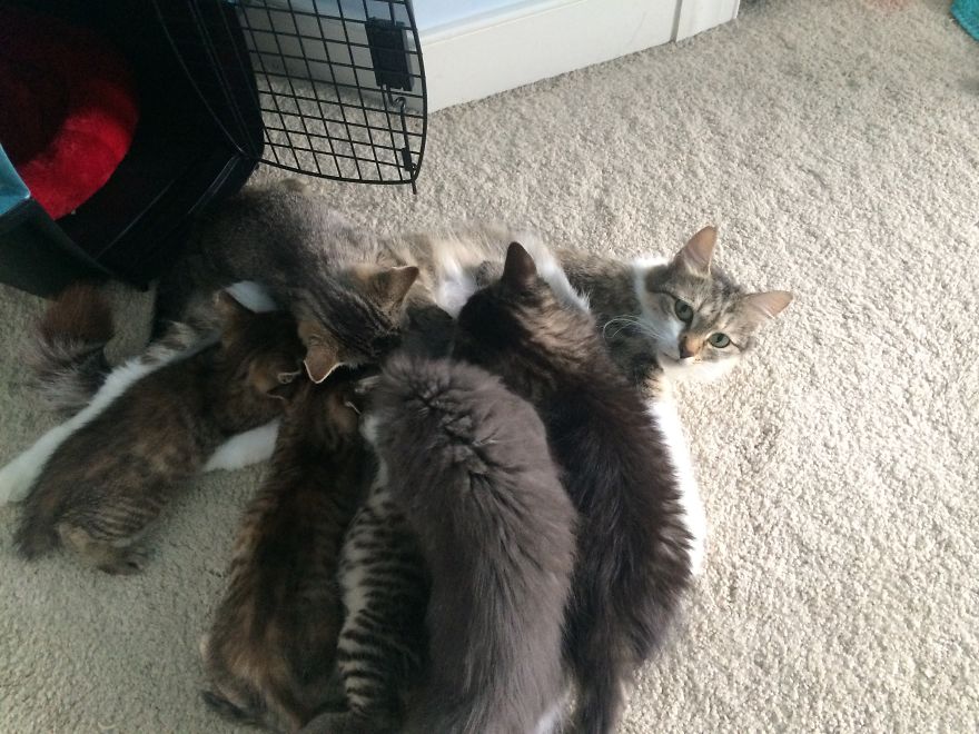 Roxie didn’t just raise her own three kittens… she also took on three orphans and nursed them!