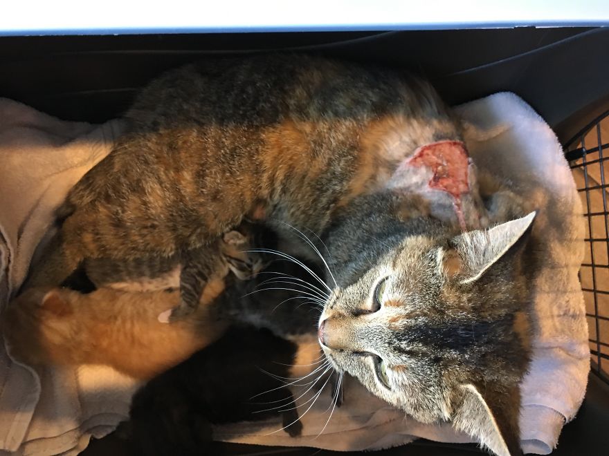 By the time her kittens were weaned, her immune system was so weak that her hair started falling out