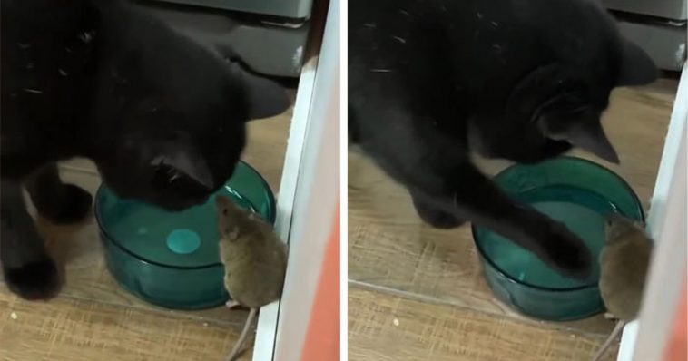 Simon’s dad saw the cat drinking from his water bowl and next to him was a mouse.