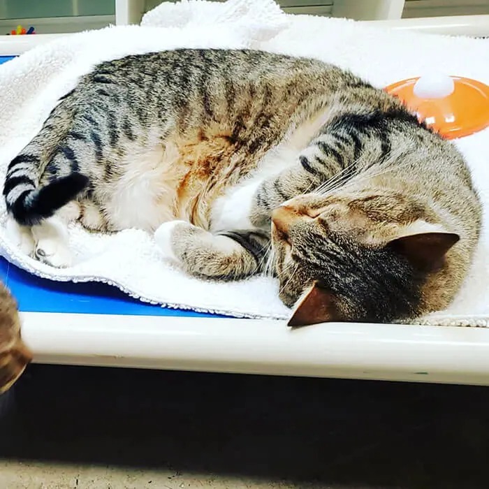 Quilty has subsequently been re-proofed in the kitty room, while he had a break in the lobby. While he was confined to the lobby, his housemates missed him. They were having a good time around the shelter at night. The staff, on the other hand, did not miss the morning cat wrangling, so we’ll have to agree to disagree.”