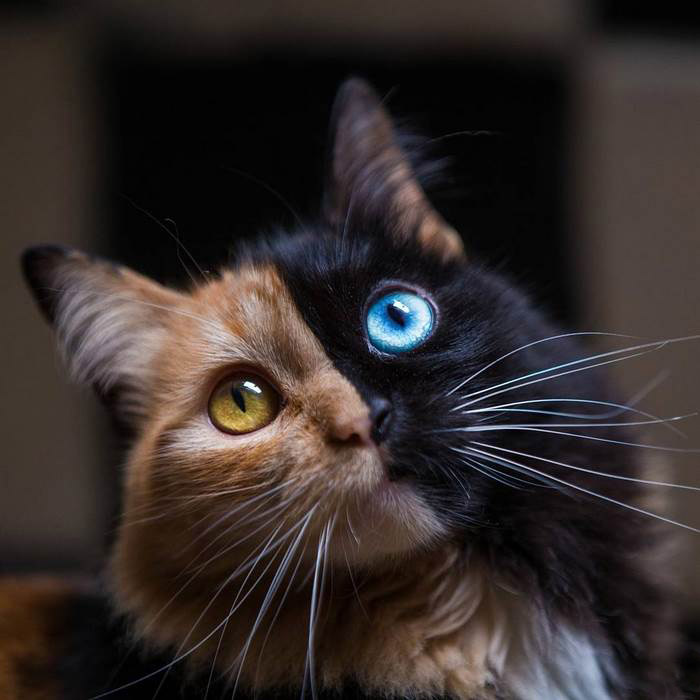 Quimera may be what’s known as a Genetic chimera cat, a rare natural occurrence whereby an individual is made up of cells from at least two different original eggs. They fuse together to become a single organism whose DNA is from two completely different individuals.