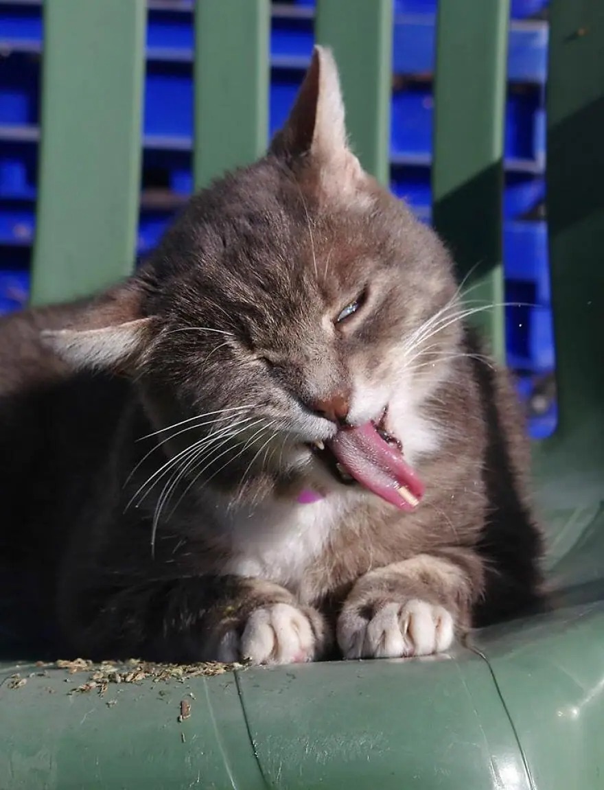 He and his neighbor usually treat their cats with catnip and take photos of them blasting on the herb!