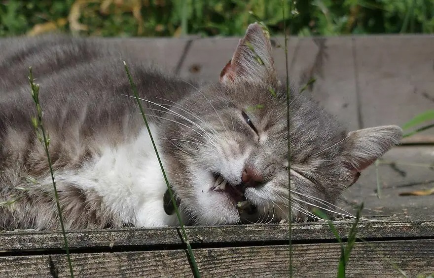Cats take in catnip by sniffing or eating, licking. The most common behaviors that catnip has on them are rolling on the ground, licking, chewing, flipping, rubbing. When they overdose, they can drool, growl, purr, scratch, or zone out. However, a session usually lasts for 10 – 15 minutes and wears off gradually.