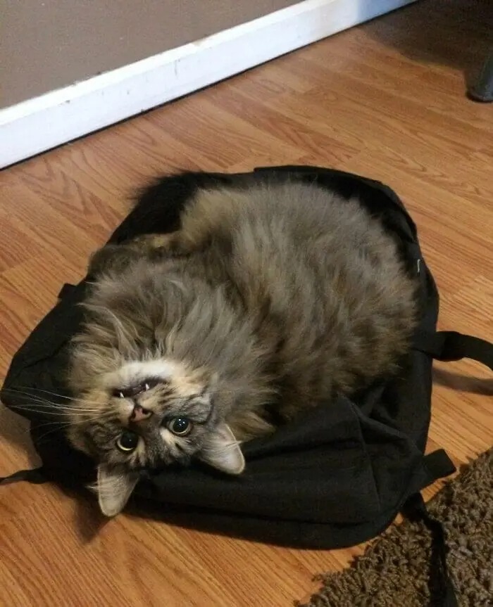 #33 “Maybe if I act really cute and lay on her backpack she won’t go to work…”