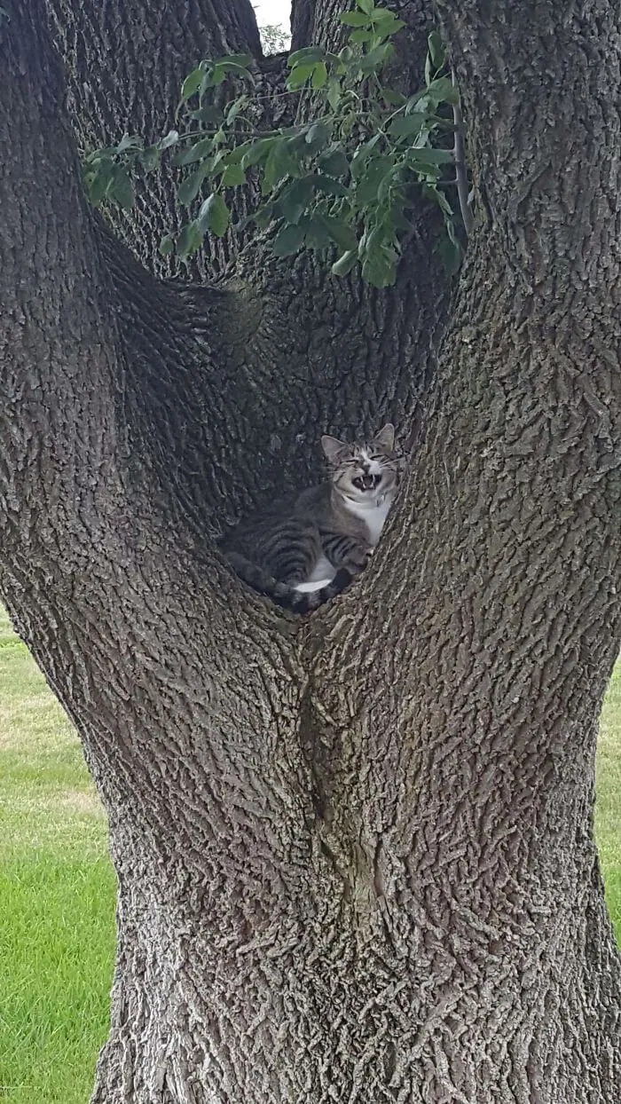 Cats sometimes chase their prey, like a squirrel, chipmunk, or a bird, up a tree. Cats can climb a tree to take a nap, or even hang out with other cats! But aside from all the fun up there, it’s not as easy for them to climb down as when they climb up. Ingrid confirmed that cats have more trouble climbing out of trees than climbing upon them.
