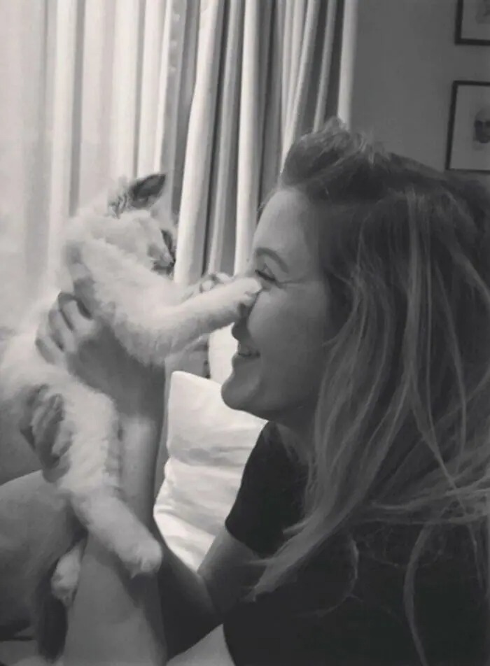 Drew Barrymore is a huge cat person. She adopted three rescue kittens in 2018 and named them Lucky, Peach, and Fern (from left to right).