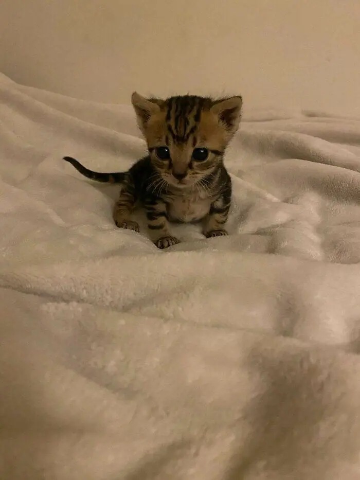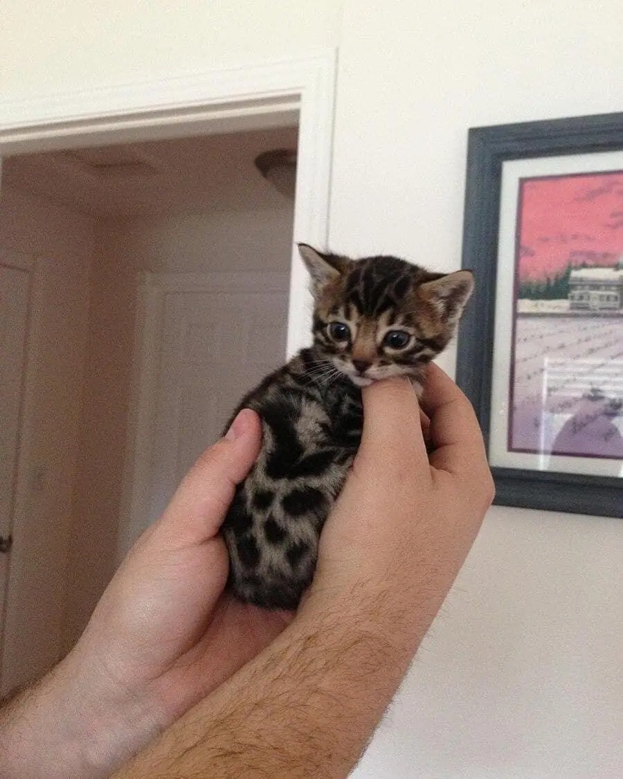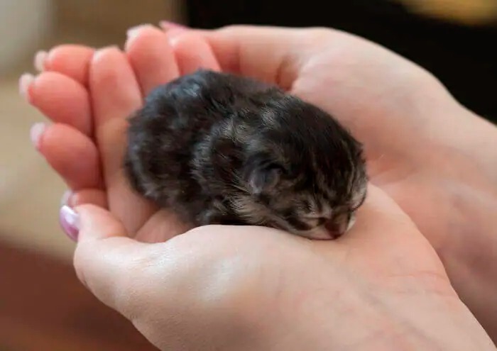 When a kitten is born, it has no defense capabilities: eyes are closed, ears are closed, and they can’t even stand, keep warm, or eat by themselves. At this stage, they fully trust their mother. They fit in our palms and weigh 35 ounces. These babies spend about 90% of the time sleeping and eating the other 10% of the time.