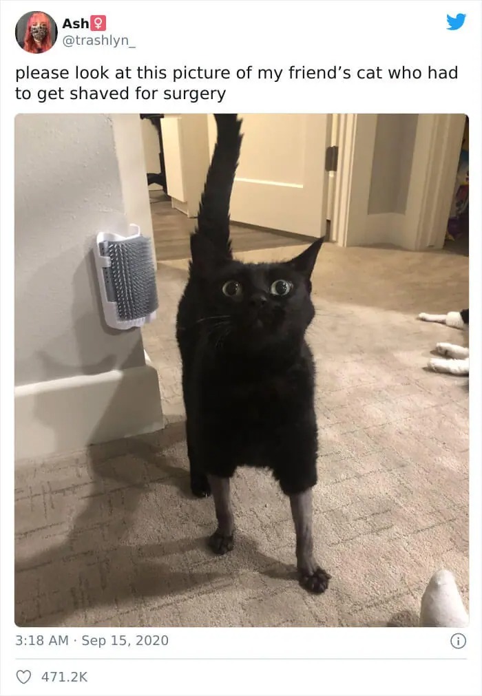 Lately, a Twitter user Ash shared a photo of a friend’s cat, she may not have thought it would be viral. but the black cat with shaved front paws (like a short trousers) had been cracking the Internet up. Ash’s tweets went viral on Twitter, and as of this article, the cat received more than 470k likes.