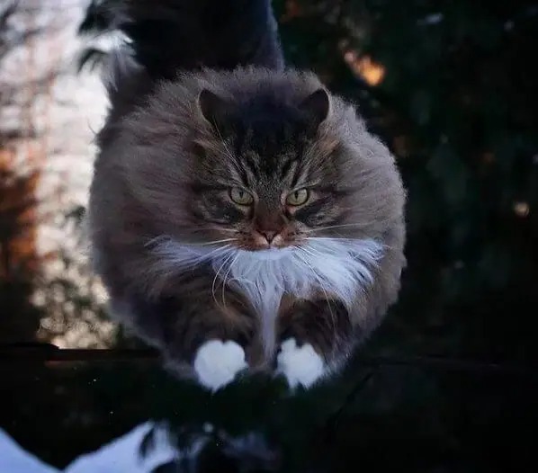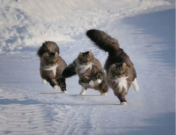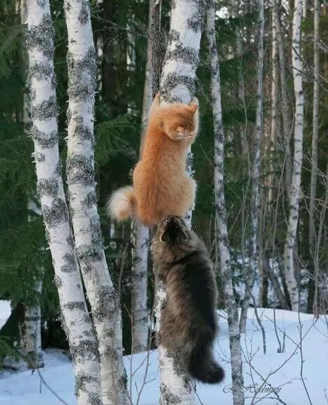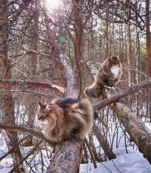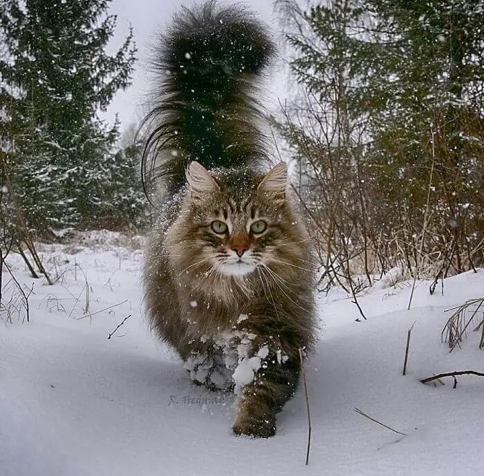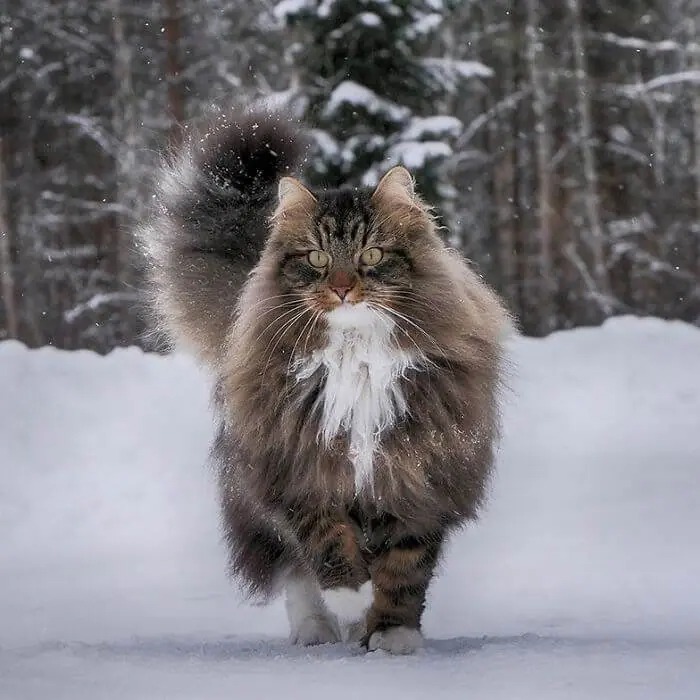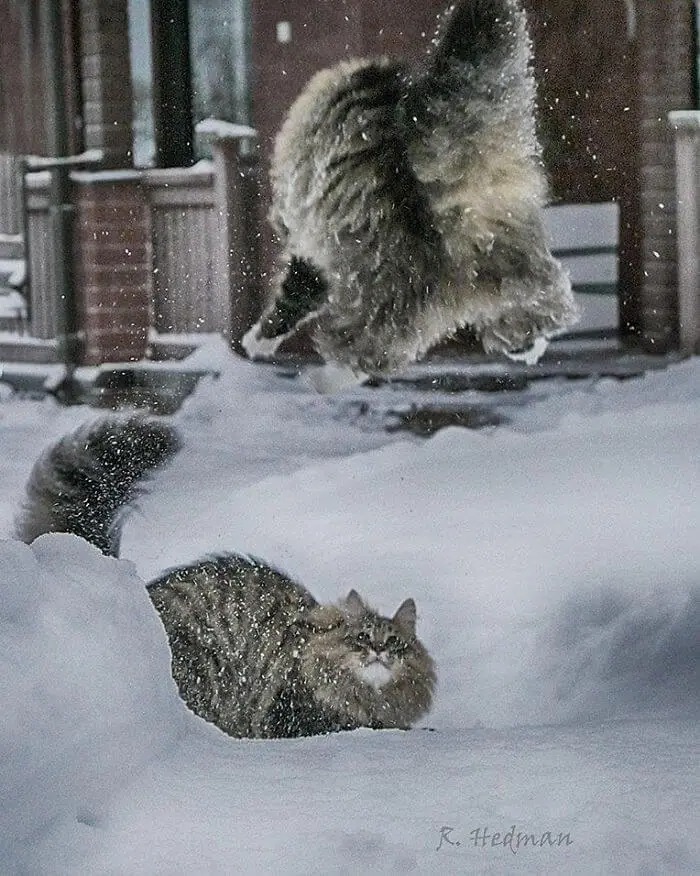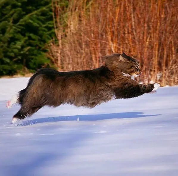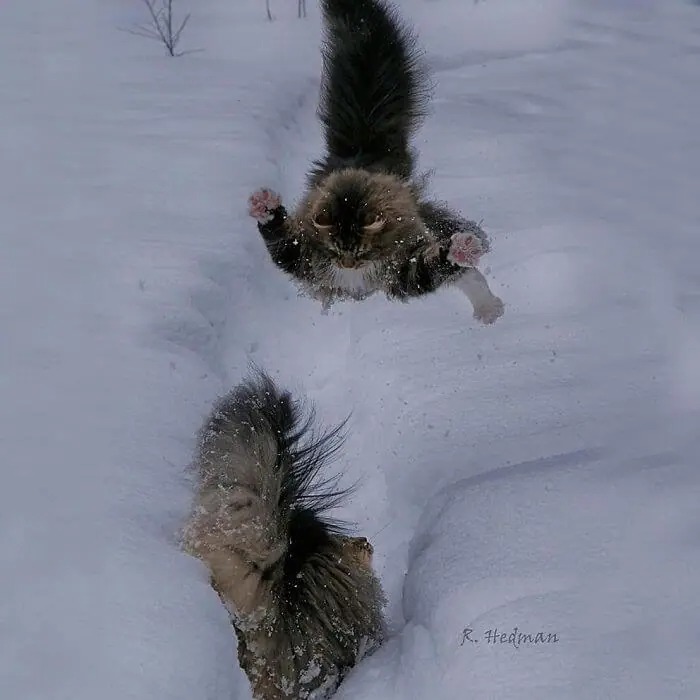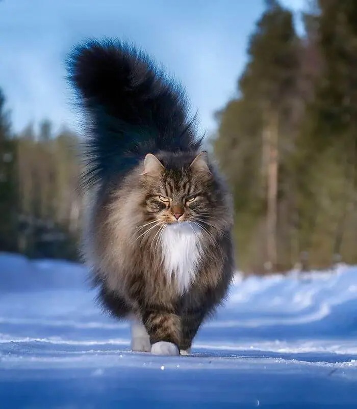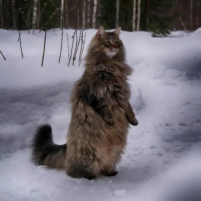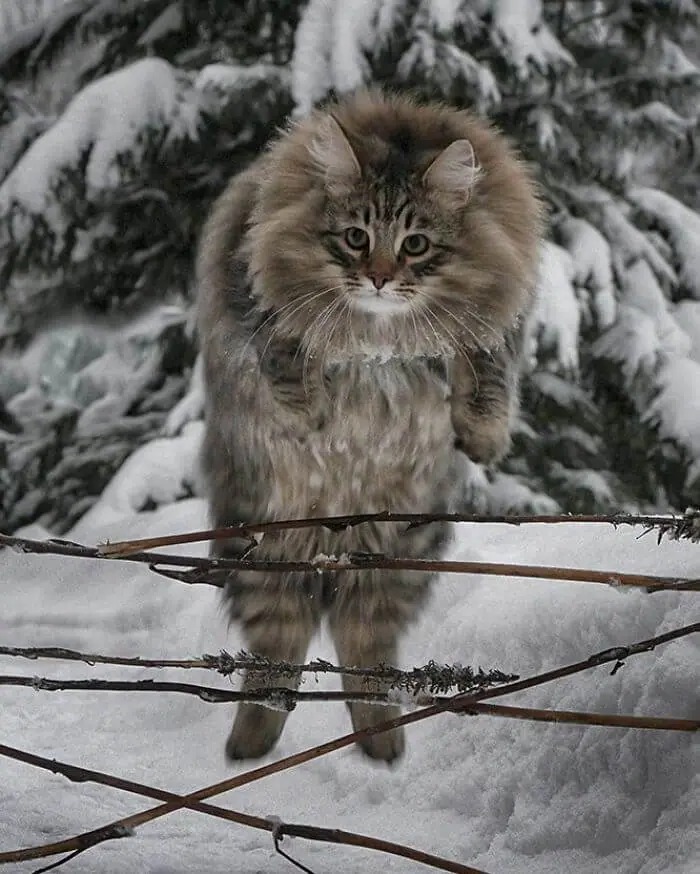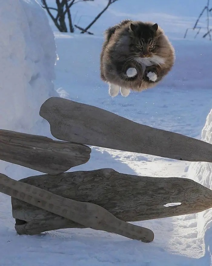 She also added that Sampy absolutely enjoys outdoor activities, especially when the weather isn’t too cold. “He is so happy when he goes with me on a small trip to the old forest near our house. There is a small river there, as well as many other exciting places, and interesting scents. Elmeri and Hiski prefer to stay in the yard, at home, but sometimes they come along for a walk. My cats jump over obstacles I build in the backyard for them, especially in the winter. It is easier to demarcate the jumping area when there is a lot of snow.”