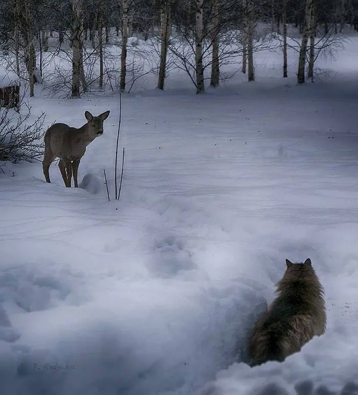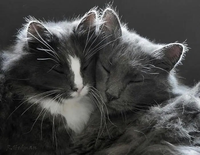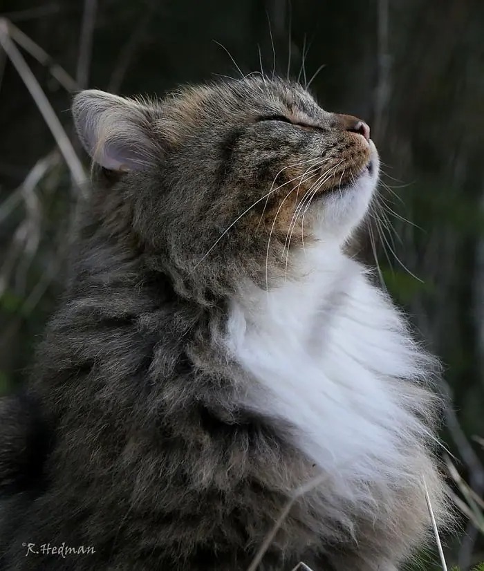“Sämpy is a 6-year-old domestic cat and isn’t a special breed, although he looks like a Norwegian Forest Cat. Elmeri, the gray cat, is 11 and he is also a domestic cat. Hiski, the biggest tabby without white paws, is a half-Norwegian Forest cat and is 2 years old. They all are neutered male cats. On my sites, there are also pictures of a gray-white cat, Nelli, but she passed away earlier this year,” Riikka explained.