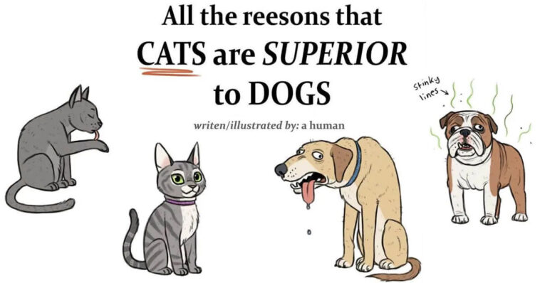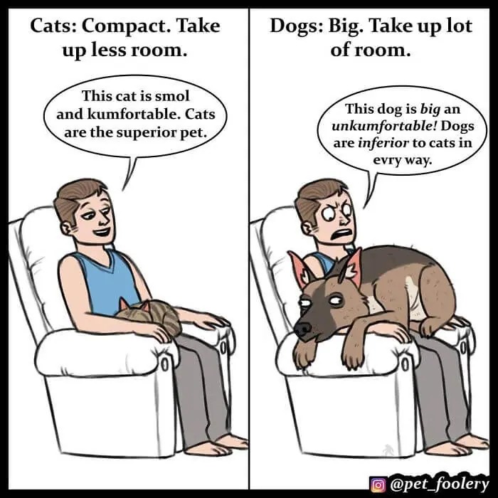 Cats are normally smaller than dogs and they’re way more flexible than a human, so it’s easier for them to curl up and nap on the owner’s lap. The artist is trying to draw the dog ugly and big and a space taker. Have you ever thought what if he drew a Maine Coon cat and a Chihuahua dog? Cat 3-0 dog.
