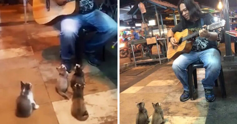In the video, the 4 music lovers were sitting still, the busker he was also laughing when he was on half way playing his song. Those cats began to bob their fuzzy little heads just like they were really enjoying the performance of this street artist! That wholesome moment was recorded by the man’s friend and that guy posted on the Internet with the caption: