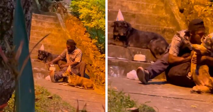 A homeless man was seen throwing a humble birthday party for his two dogs, singing them ‘Happy Birthday’, giving them hugs, and treating them to cake all whilst sitting on the stairs of a public park, having no other means of shelter. But that would soon change.