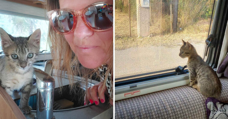 A little kitten runs up to the camper where a couple is relaxing on the beach and becomes a part of the journey.