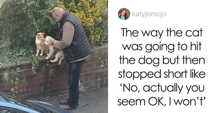 The man, being a polite gentleman, petted the cat to say hello, its soft fur grazing against his skin. The short exchange earned a purr, the feline seemingly enjoying the attention. But what kind of gentleman would he be if he didn’t allow the curious pup to make its acquaintance.