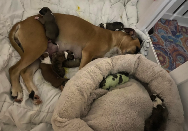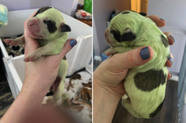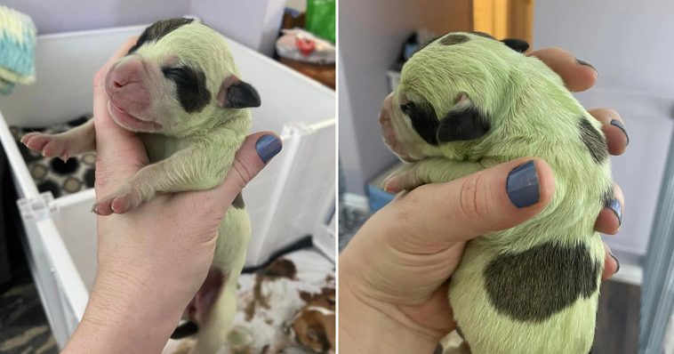 A Bulldog named Freya had given birth to a litter of eight with a pup coming out of the unusual color, green. The owners, Trevor and Audra Mosher said the possible names for the puppy would either be Fiona (Shrek’s princess), Hulkette, or Pistachio.