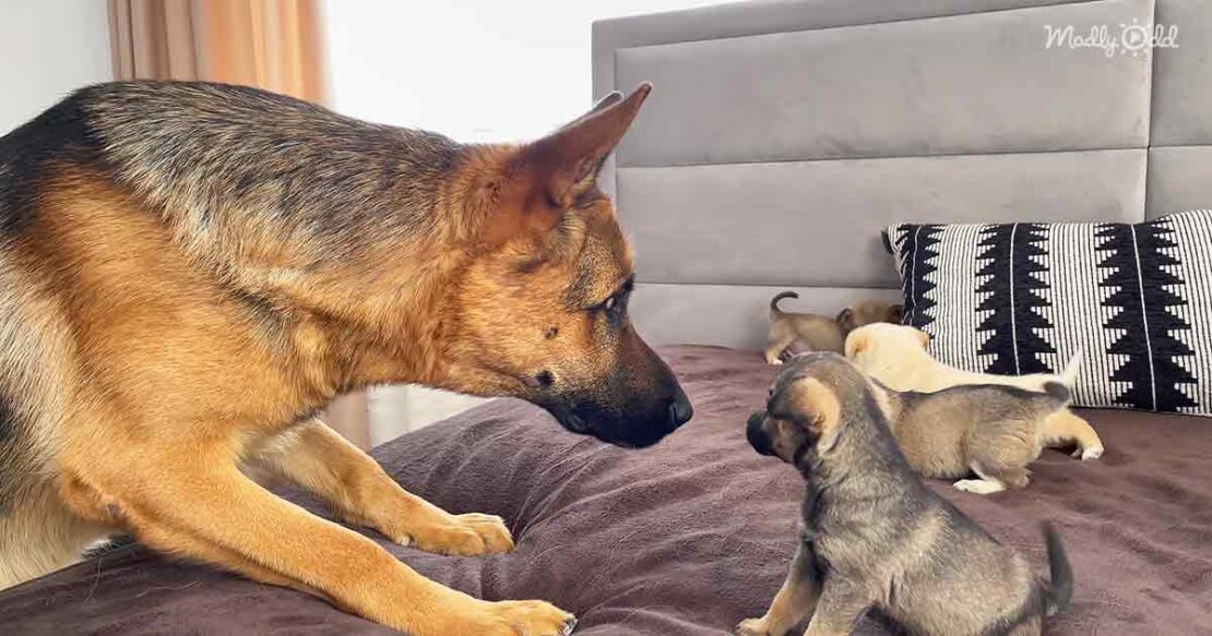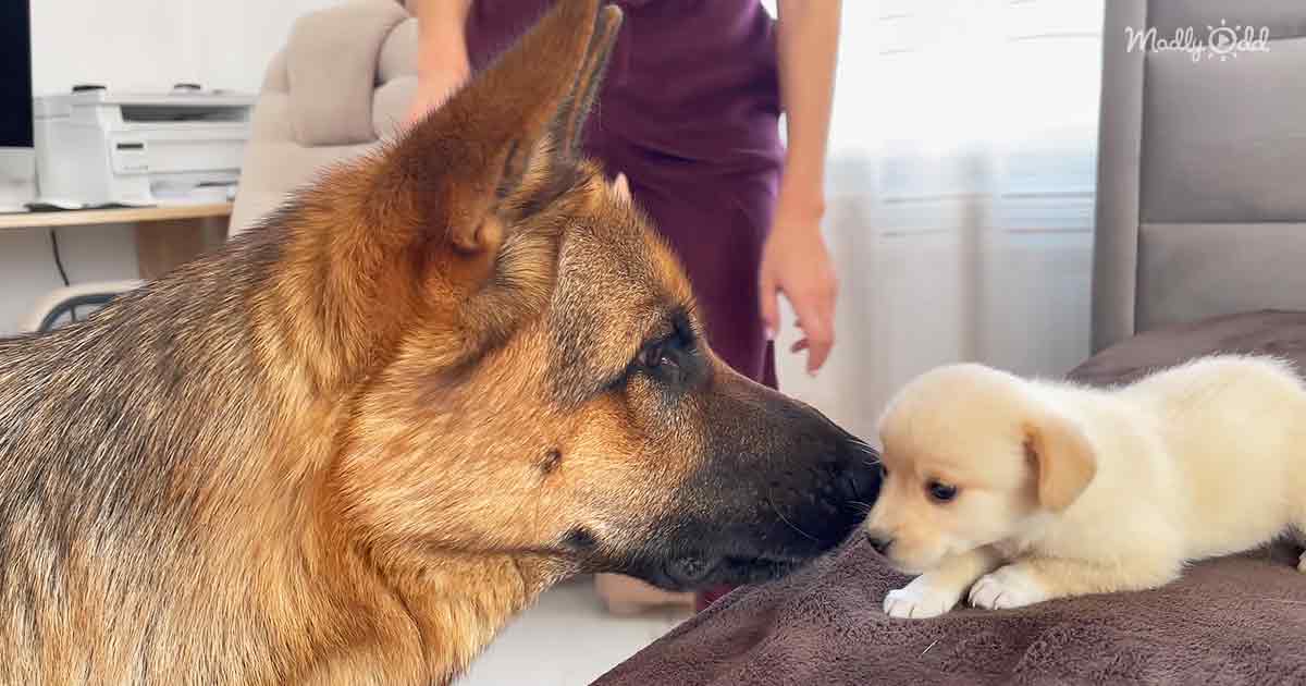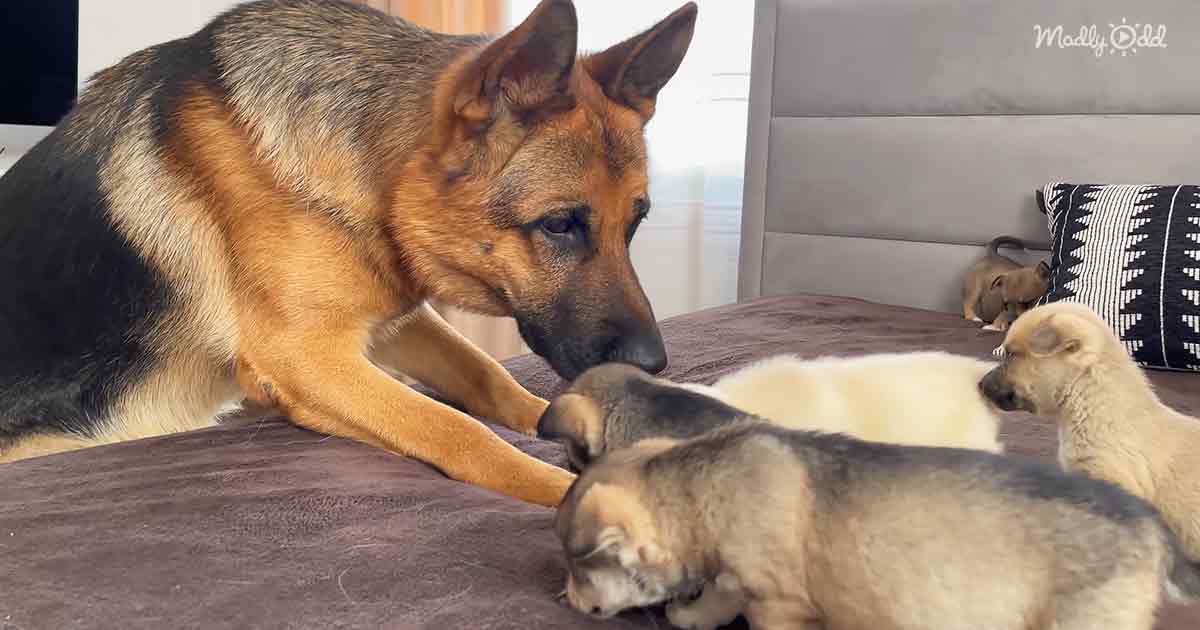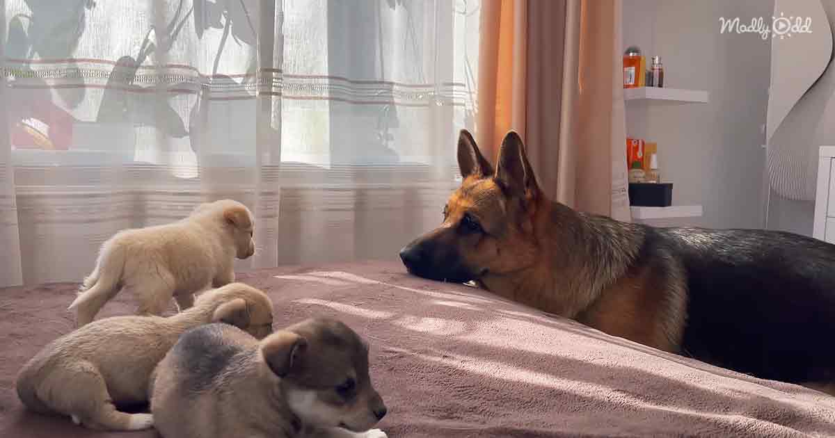 Taras had ensured that all his pets got along from a very young age. Recently, he decided to introduce 5 adorable puppies to his gentle yet giant German Shepherd, Rocky.
