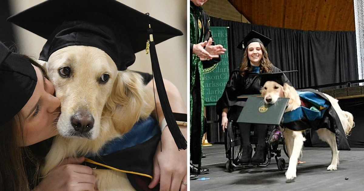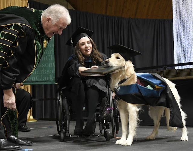 “”Griffin” Hawley, the Golden Retriever service dog, receives a congrats embrace from his owner Brittany Hawley after receiving an honorary diploma from Clarkson on Saturday, December 15, 2018, during the Clarkson University “December Recognition Ceremony” in Potsdam, N.Y. Brittany Hawley, Griffin’s owner, also has a doctorate degree in Occupational Therapy. Both students attended all of their classes together.