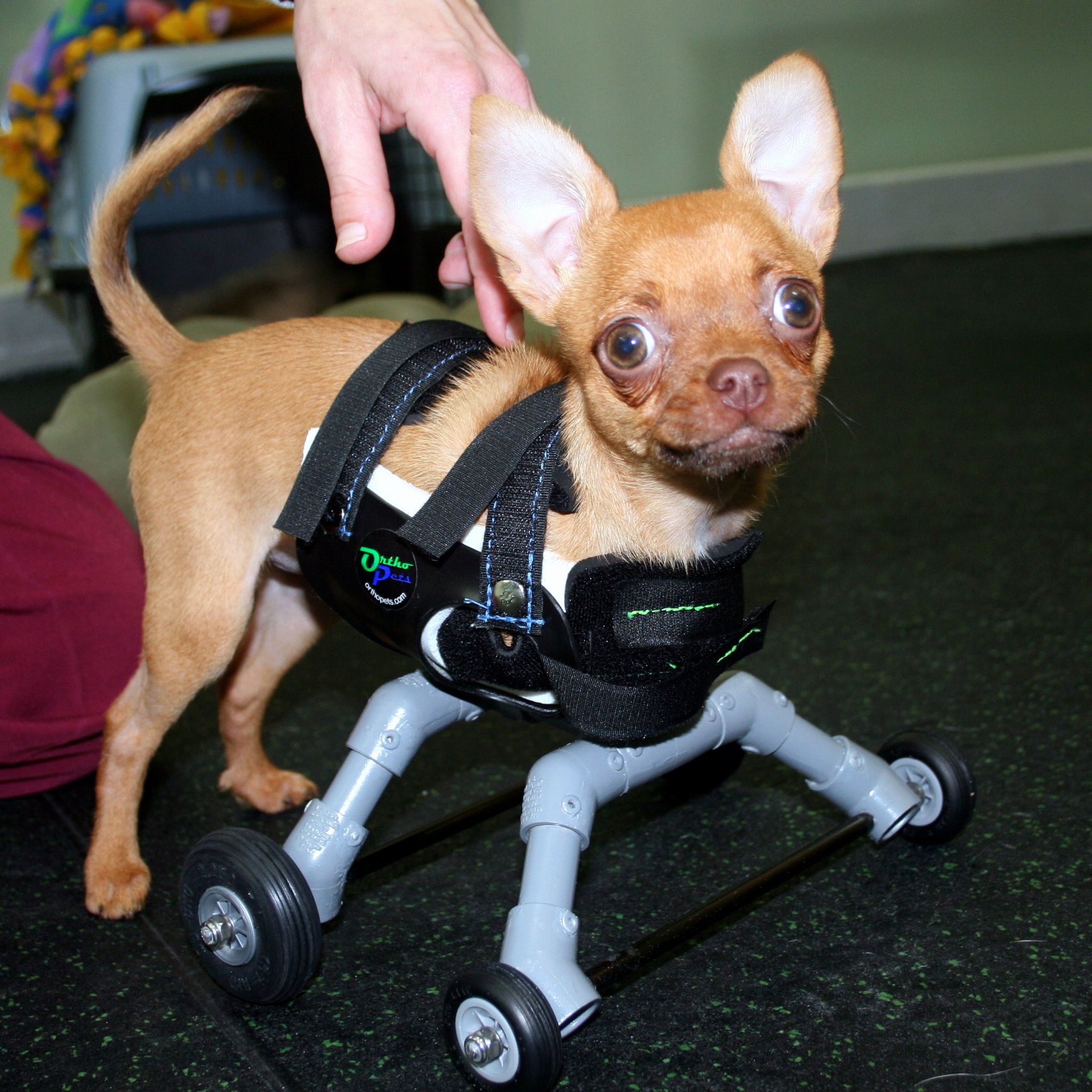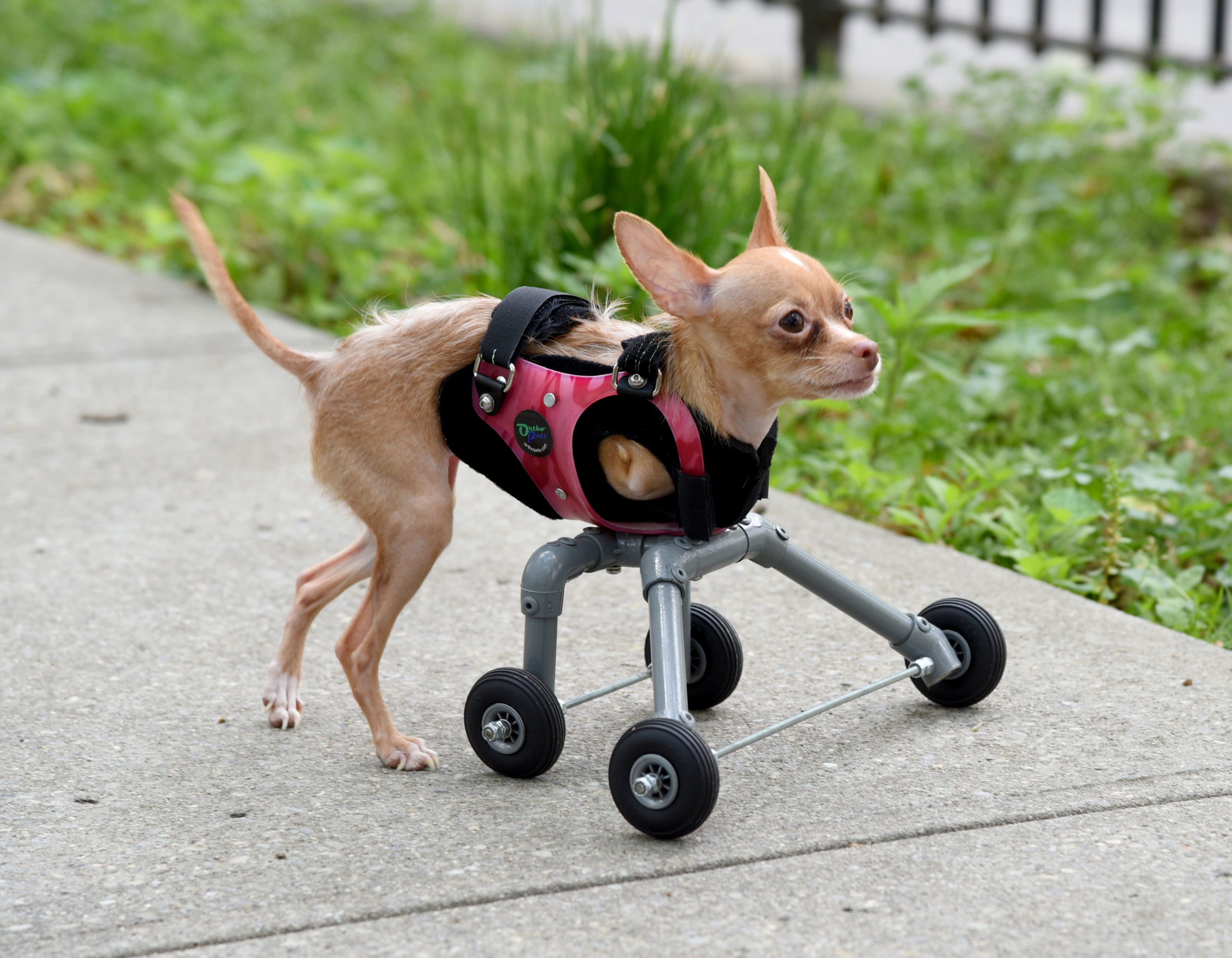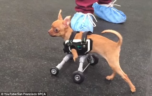 **MANDATORY BYLINE** PIC FROM ASPCA / Caters News – (PICTURED: Chispi wearing her wheelie vest) – A CHIHUAHUA born with no front legs has been given a new lease of life after a team of vets went the extra mile and built her some custom made wheels. Little Chispi spent most of her time being carried and when she did walk could only manage a few steps before falling over. But with the help of American Society for the Prevention of Cruelty to Animals (ASPCA) the pup can now run and live a normal dogs life. They designed a custom-made wheelie vest created by a company that also made prosthetics for a dog born without hind feet. Chispis disability also weighed heavily on her owners who briefly considered giving her to a shelter, according to ASPCA. SEE CAERS COPY