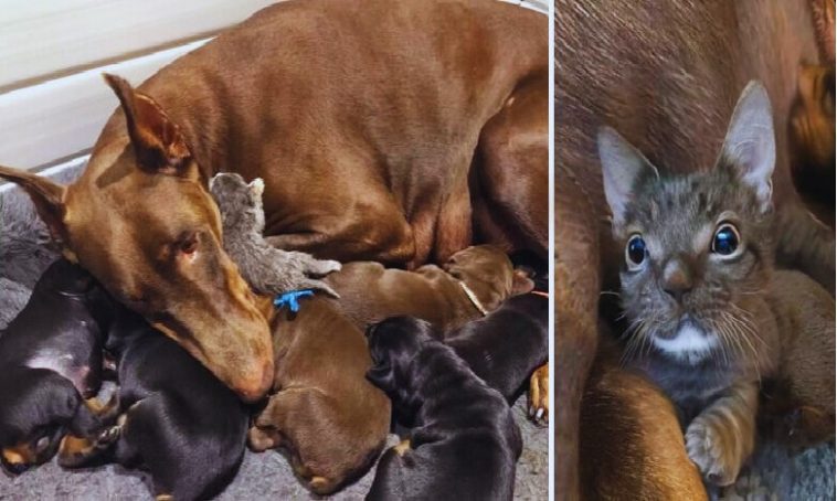 Ruby is a Doberman Pinscher who lives with her owner Brittany Callan in the town of Geneseo, in upstate New York. Just one week after giving birth to a litter of six puppies, she accepted and raised an abandoned newborn kitten as her own.