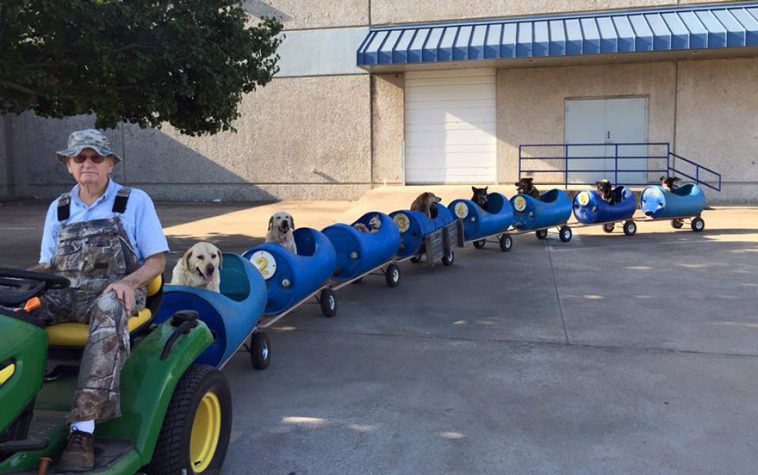 Now, the 80-year-old retiree takes his rescued dogs on a train ride twice a Weekend