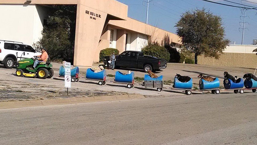 His homemade dog train takes rescued strays out for fun rides around the neighborhood and in the surrounding woods.