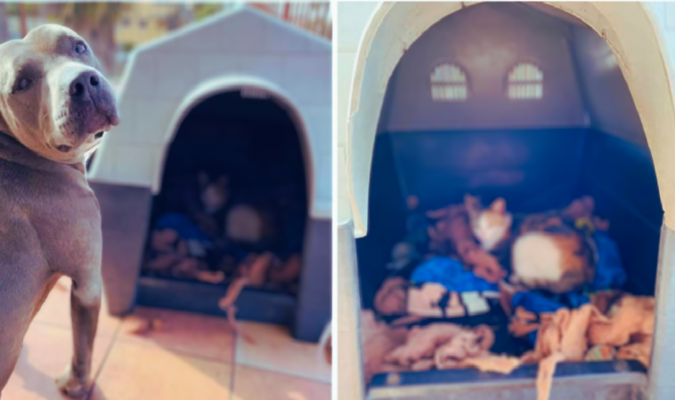 Under the dog’s tender watch, the cat gave birth to two beautiful kittens. Cozy in the home she was offered, the new mother cat couldn’t have been happier with her babies. Nor could Hades, having been there to welcome them.