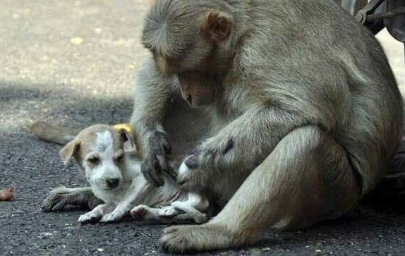 The monkey, like a protective father, took the puppy under its wing and shielded it from the perils that lurked around. It stood watch by the puppy’s side, repelling any stray canines who came too close. The bond between the monkey and the dog astounded the locals. Their love and affection for one another has been called as the most caring thing in the world.