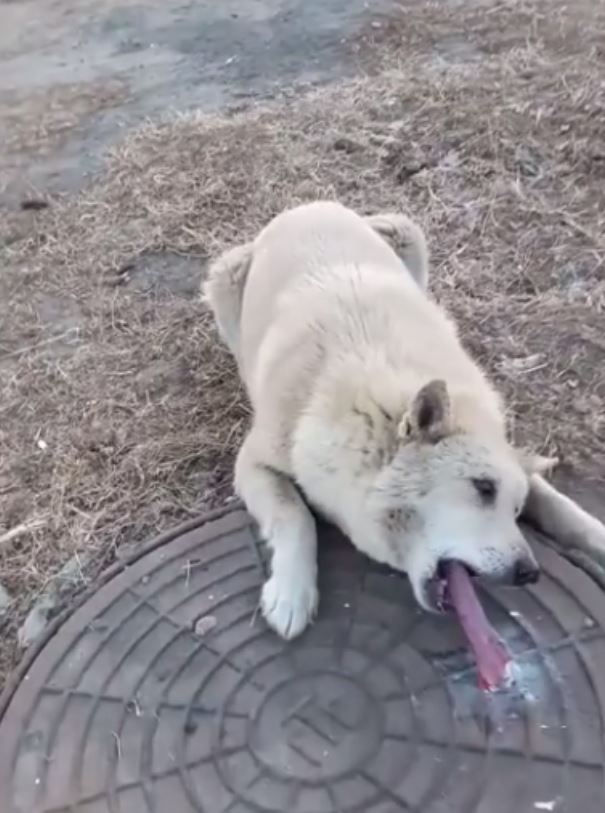 In frigid weather, a sick dog got his tongue stuck to a manhole cover.