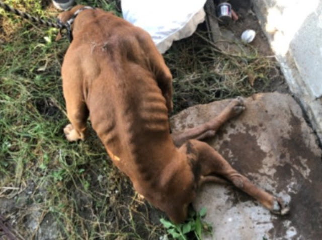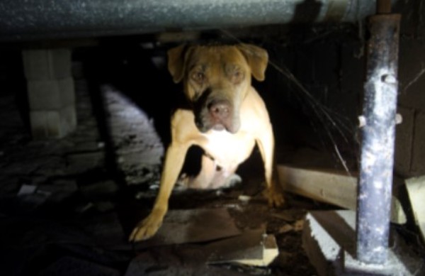 They could see the brown Pitbull with their spotlights even though it was pitch black. When Donna crept closer to him, he hunched in a corner and gave out a low growl. After she threw a wiener at him, he suddenly stopped snarling. Scooch pulled himself with his front legs when he saw the meal.
