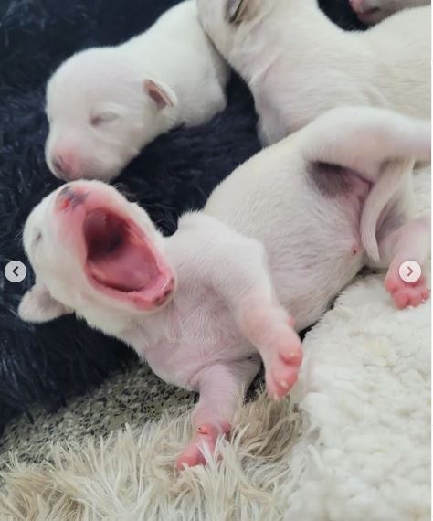 Natajuli and her 14 babies were taken to the vet for a short check-up, ultrasound, and blood tests; she is red-faced. Her 14 puppies are all plump and weigh a lot.